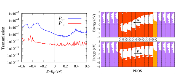 图2. (a)BaTiO3厚度为8.5 u.c.的NaTi-FTJ的左极化态和右极化态的透射函数;(b)BaTiO3厚度为8.5 u.c.的NaTi-FTJ的左极化态和右极化态的层分辨的投影态密度。紫色、橙色和黄色分别代表Pt电极、BaTiO3中TiO2原子层和右界面处NaO2原子层的投影态密度。