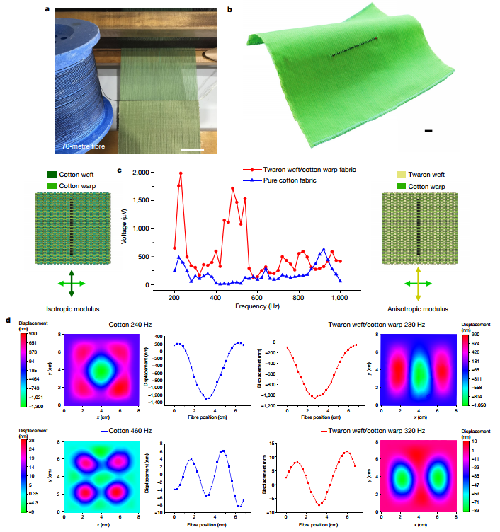 近日,麻省理工学院 Yoel Fink团队Wei Yan一作,在Nature上发文,报道了一种听觉系统仿生织物,可以作为灵敏的听觉麦克风,同时保留了织物的传统品质,如机洗性和悬垂性。织物介质是由棉经纱cotton warp纬纱weft中的高杨氏模量纺织纱线 textile yarns组成,将可听频率10-7个大气压微弱压力波,转换为低阶机械振动模式。编织到织物中的是热拉伸复合压电纤维,其与织物一致并将机械振动转换为电信号。