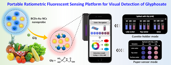 图1. 比率荧光传感器快速可视化定量检测草甘膦残留示意图。