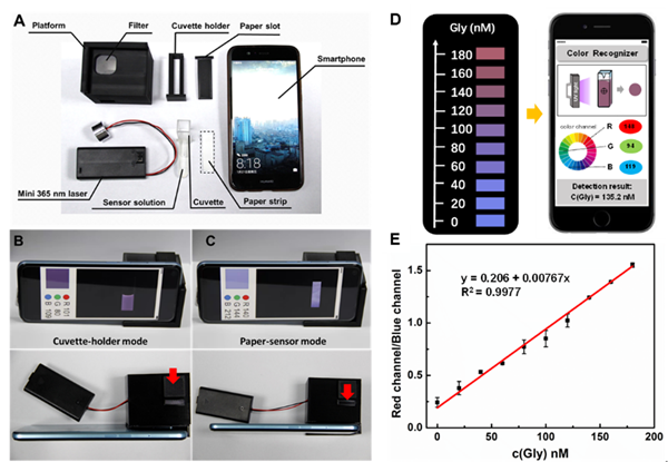 图2. 基于智能手机的监测平台可视化定量检测草甘膦。