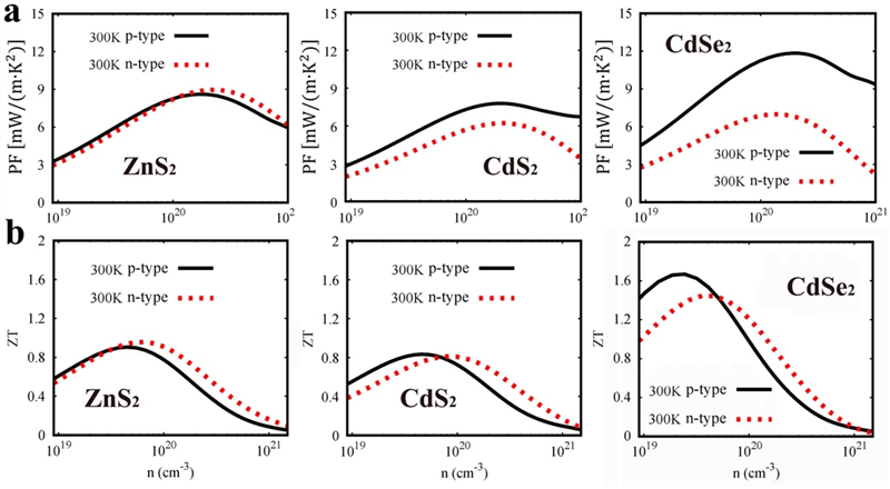 图3. 室温下,三种Pyrite型化合物在不同载流子浓度下的电学输运性质(PF)(a)和热电优值(ZT)(b)。