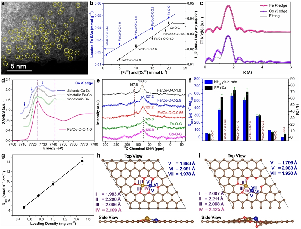 图1. (a) Fe/Co-O-C-1.0样品的球差校正的HADDF-STEM图; (b) Fe-O-C、Co-O-C和Fe/Co-O-C-r上负载的Fe和Co-SA含量与初始加入的Fe3+和Co2+浓度的线性图;(c) Fe/Co-O-C-1.0样品Fe K边和Co K边的R空间EXAFS拟合光谱图;(d) Fe/Co-O-C-1.0样品的Co K边XANES光谱图和理论计算模拟(FEFF8.4)得到的双原子Co-Co、单原子Co和双原子Fe-Co的XANES光谱图对比;(e) Co-O-C、Fe-O-C,Fe/Co-O-C-0.56,Fe/Co-O-C-2.9和Fe/Co-O-C-1.0的13C 固体核磁图谱;(f) Fe-O-C、Co-O-C、纯BC碳化得到的CBC和Fe/Co-O-C-r负载于玻碳电极上(3.0 mm直径,负载量:0.50 mg cm−2)在 −0.30 V (vs. RHE) 对应的氨产率和法拉第效率;(g) 玻碳电极上(1.0 ×1.0 cm2)Fe/Co-O-C-1.0的负载密度对几何面积活性的影响;(h) 石墨碳上优化的[(O-C2)3Fe-Co(O-C2)3]结构;(i) 石墨碳上优化的[(O-C2)3Fe-Co(O-C)C2]结构。