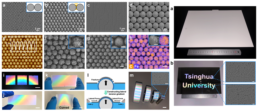 清华大学机械系汪家道教授课题组在研究中将张力梯度创新性引入到液气界面自组装中,提出了独特的张力梯度诱导纳米颗粒液气界面快速大面积自组装方法。在该研究中,首先建立了基于表面张力与纳米颗粒表面疏水改性的液气界面纳米颗粒松散悬浮构造方法及设计准则。进一步利用负载表面活性剂的凝胶构建液气界面张力梯度,诱发界面对流,打破纳米颗粒间的静电排斥能量壁垒,快速形成密排有序的大面积胶体晶体自组装结构。实验显示了液气界面横向毛细力能够诱导自组装但同时会损害自组装有序性的“双刃剑”作用,提出并证明了基于张力梯度抑制界面毛细团聚作用和提升液气界面自组装质量的有效性,实现了不同尺寸(从400纳米至8微米)、不同形状(球形、花簇状、核壳结构等)微纳米颗粒自组装薄膜在各种基底表面的可控制备。研究基于张力梯度自组装的灵活可持续构建优势,一定程度上解决了纳米颗粒在曲面上的高质量自组装制造难题。研究实现了超1000cm2自组装结构在几秒时间内的超快制备,制造面积和速度相比传统方法提升两个数量级以上,在一定程度上有效解决了大尺寸自组装结构工业化难题。