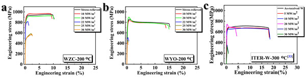 图2. (a) WZC, (b) WYO和(c) ITER-W试样热冲击后的拉伸应力-应变曲线。