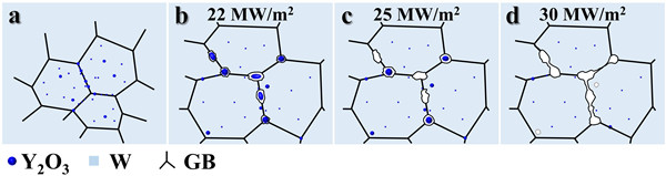 研究团队基于EBMP-30电子束热负荷平台,以两种代表性的弥散强化钨材料W-0.5wt% ZrC(WZC)和W-1.0wt% Y2O3(WYO)为研究对象,在10-30 MW/m2热负荷功率密度(APD)范围内,研究了多次热负荷冲击下材料的损伤行为。当APD ≤ 20 MW/m2时,WZC和WYO试样的微观结构和拉伸性能(图2)相比初始样品均无明显变化。但当APD ≥ 22 MW/m2时,WYO试样发生再结晶和明显的晶粒长大,同时观察到Y2O3颗粒从W基体脱落,WYO的极限抗拉强度(UTS)从861 MPa下降到510 MPa,总延伸率(TE)从15%下降到接近零(图2b)。结果显示,由于Y2O3颗粒与W基体之间的热膨胀系数不匹配,热加载过程中粗大的Y2O3颗粒受热膨胀会挤压W基体,使W基体发生不可逆的塑性变形,冷却后Y2O3颗粒收缩导致Y2O3颗粒与W基体之间形成微裂纹,最终在多次热疲劳作用下粗大的Y2O3颗粒从钨基体脱落,形成孔洞和宏观裂纹(图3)。而WZC由于高的再结晶温度(RCT)(~1300 oC),在22 MW/m2的热加载后,仅发生部分再结晶,仍保持816 MPa高的UTS值(图2a)。此外,由于WZC合金中ZrC的热膨胀系数与W基体相当,且ZrC颗粒尺寸细小、分布均匀,有效避免了ZrC颗粒脱落和微裂纹的形成。