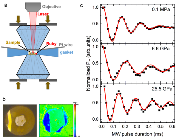 近期,中科院合肥研究院固体所计算物理与量子材料研究部刘晓迪团队联合中国科学技术大学李传锋、许金时教授团队和四川大学王俊峰研究员,首次实现了高压环境下碳化硅双空位色心自旋量子态的相干调控和高压磁探测。相关结果以“Coherent Control and Magnetic Detection of Divacancy Spins in Silicon Carbide at High Pressures”为题发表在Nano Letters (Nano Lett., 22,9943(2022))上。 在高压条件下物质会表现出很多新奇的性质,高压可以诱导绝缘体-金属(乃至超导体)转变,例如,高压下氢分子转变为金属氢(理论预言其为高温超导体);高压下镧氢体系实现260 K以上的近室温超导。然而,原位磁测量一直是高压科学研究的难题并制约着高压超导抗磁行为和磁性相变行为的研究。基于金刚石对顶砧的高压研究中,通常样品尺寸很小仅为微米级且不均匀,这会导致高压下的磁信号弱,探测分辨率需要在微米量级。因此,发展一种新型的高压原位磁性精密探测的手段十分必要。