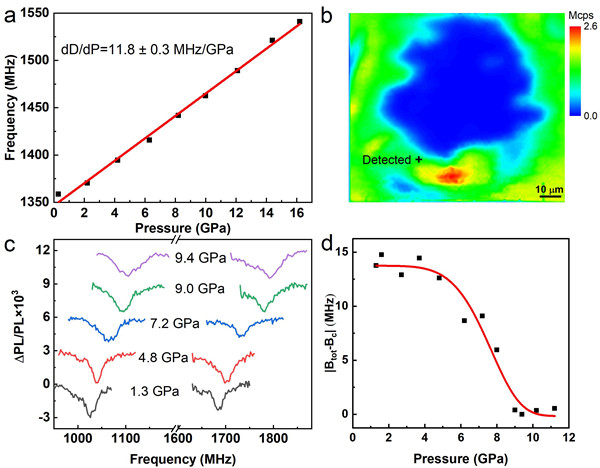 研究人员对碳化硅双空位缺陷在高压下的光谱及自旋性质进行了系统的研究,实现了高压环境下碳化硅双空位的自旋量子态相干调控,并基于此在高压下对磁性材料钕铁硼Nd2Fe14B的铁磁-顺磁相变进行了探测。研究表明碳化硅双空位的荧光光谱随压力发生蓝移,ODMR谱共振峰随压力向高频方向线性移动。其中双空位PL5缺陷的零场分裂D值随压力变化的斜率最高可达25.1MHz/GPa,高压传感灵敏度为0.28MPa/Hz-1/2。通过读取邻近Nd2Fe14B样品双空位缺陷的ODMR谱,获取两个共振峰的位置,由此获得探测磁场的大小,实现对压致磁相变的探测。该研究为高压传感和原位精密磁探测提供了一个新的方法。