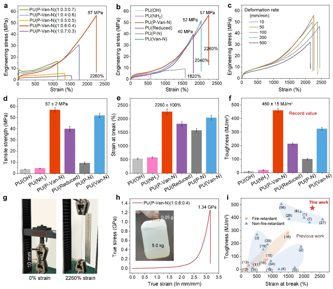 图2. 力学性能. a)P-Van-N和PTMEG含量不同时PU (P-Van-N)的工程应力-应变曲线. b)硬段结构不同时PU的工程应力-应变曲线. c) 不同拉伸速率下PU(P-Van-N)(1:0.6:0.4) 的工程应力-应变曲线. 不同硬段结构PU的d)拉伸强度, e) 断裂应变和 f) 韧性值. g) PU(P-Van-N)(1:0.6:0.4)的拉伸示意图. h) PU(P-Van-N)(1:0.6:0.4)的真实应力-应变曲线. 插图: PU(P-Van-N)(1:0.6:0.4)薄膜(50 mg)拉起5.0 kg 重物的示意图. i) PU(P-Van-N)与文献报道的阻燃型和非阻燃型聚氨酯弹性体的韧性和断裂应变的比较.