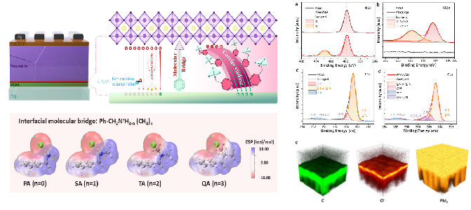 •开发的建鲁棒性的钙钛矿-基底界面技术,采用分子桥构型Ph-CH2N+H3-n(CH3)n(n为锚定位点的取代程度),实现界面载流子的选择性高速率传输,为进一步提升高效、稳定的PSCs器件提供了新的优化方向,获得了25.45%的光电转换效率。 |
