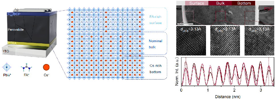 •通过均匀化钙钛矿组分面外分布策略制备的反式钙钛矿太阳电池获得了26.1%的最高效率,认证效率为25.8%。此外,在2500小时最大功率电追踪后(MPPT),未封装的器件仍保持其初始 PCE 的 92% 的可靠运行稳定性为进一步提升高效、稳定的钙钛矿太阳电池提供了明确的方向,对推动PSCs走向商业化发展具有重要意义。 |