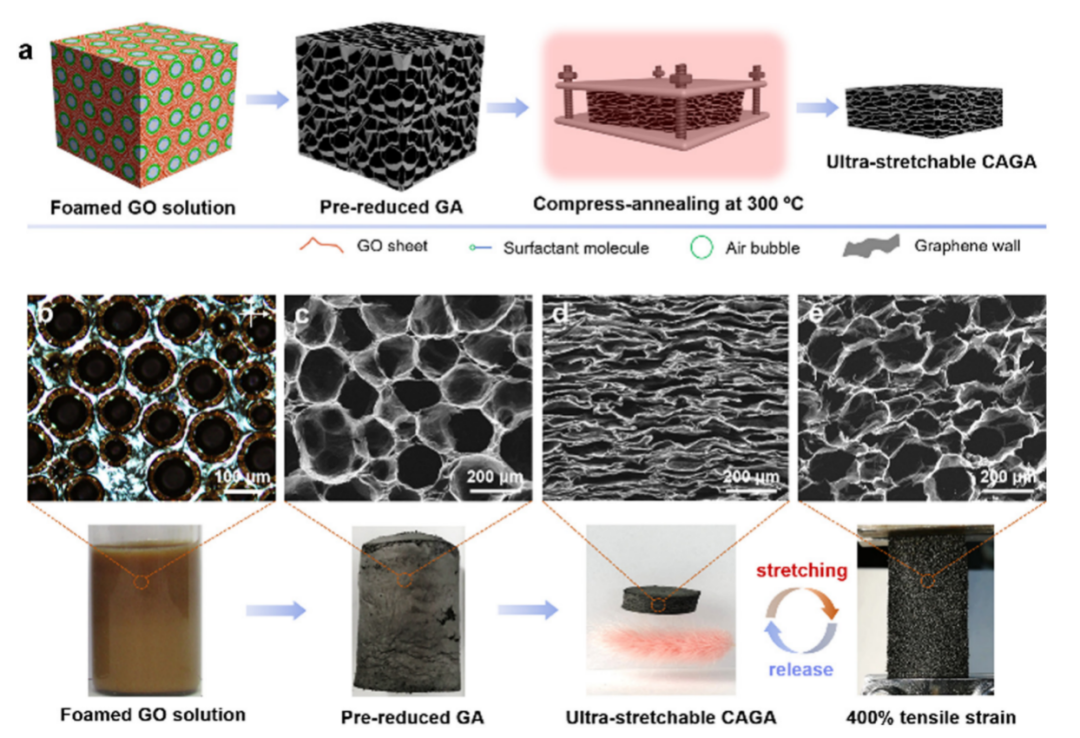 石墨烯气凝胶具有多孔且稳定的交联网络,表现出了许多特殊的力学性能,如超高可逆压缩形变(99%应变)、在极端温度(4 K - 1273 K)下,具有优异的疲劳耐久性(100万次压缩)和机械稳定性。独特的机械性能加上多功能性,使石墨烯气凝胶比聚合物基功能材料更有希望应对极端恶劣环境。近几年,张建明教授团队在石墨烯气凝胶规模化制备和高性能化方向取得了一系列成果,包括:常压干燥法制备高压缩弹性石墨烯气凝胶(J. Mater. Chem. A 2015, 3, 19268.),气泡模板法制备大尺寸高压缩弹性石墨烯气凝胶(ACS Appl. Mater. Interfaces 2019, 11, 1303.),胶乳复合策略制备结构稳定的石墨烯气凝胶(ACS Appl. Mater. Interfaces, 2020, 12, 1378.),石墨烯/ZIF-8杂化气凝胶(ACS Appl. Mater. Interfaces 2018, 10, 827.),高效光热产水石墨烯/PVA复合凝胶(ACS Nano 2021, 15, 12, 19877–19887),超快热还原石墨烯气凝胶(Chem. Commun., 2022,58, 13349-13352)等。然而,与传统橡胶或水凝胶相比,目前石墨烯气凝胶的可逆拉伸应变(最大200%)仍然非常低,极大限制了该类材料的应用。众所周知,高卷曲的高分子交联网络赋予了聚合物超高的拉伸弹性。然而,利用陶瓷或碳材料等无机材料来构建上述结构并实现这种拉伸性能是非常具有挑战性的。这项工作中,通过简单的两步方法,开发了具有高度卷曲交联网络的超拉伸石墨烯气凝胶,实现了前所未有的-95%到400%的可逆伸长率。首先,通过气泡模板辅助方法组装直径为数百微米的交联球形石墨烯纳米壳。然后,采用压缩-退火法对球形纳米壳进行进一步的卷曲和固定。皱缩的石墨烯结构虽然可以固定,但高温退火后由于高压缩产生的许多新界面也会被焊接,就像橡胶过度交联一样,拉伸弹性很差。通过对石墨烯表面含氧基团和卷曲度的精确控制,很好地解决了这一矛盾。结果表明,当退火温度为300℃,预应变为80%时,石墨烯纳米壳形成强面内相互作用和弱界面相互作用,使高度卷曲的结构不仅可以被固定,而且可以通过拉伸重新回到球形状态。通过有限元模拟,确定了压缩和拉伸过程的变形机理。制备的超高拉伸弹性石墨烯气凝胶在-196.5℃至300℃范围内表现出类似橡胶的优异弹性。这种泊松比接近于零的导电气凝胶具有典型的低应变高灵敏度(< 50%)和大应变下特有的超低灵敏度(50% ~ 400%)。结果表明,这种新型可拉伸导电材料,可作为稳定的超可拉伸导体应用于极端低温环境,在航天探测领域具有极好的应用前景。