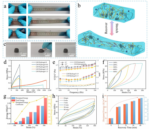 镓铟合金(EGaIn)作为一种熔点接近或低于室温的液态金属(LM),可以通过超声波分散制备成EGaIn微球,用作纳米填料。与其他刚性纳米填料不同,它们可以适应聚合物基体的变形,从而有效地增韧聚合物。此外,EGaIn中的镓(Ga)可以引发乙烯基单体发生自由基聚合。Ga3+能够与羧基、羟基进行配位,形成动态牺牲键,用于耗散能量。因此,镓基液态金属具有改善聚合物基体机械性能的潜力。 鉴于此,研究人员利用镓铟合金(EGaIn)引发聚合,同时作为柔性填料,构建了一种超拉伸和自愈合的LM/PVA/P(AAm-co-SMA)双网络水凝胶。刚性的PVA微晶网络和韧性的P(AAm-co-SMA)疏水网络的协同作用,以及聚合物网络之间的离子配位和氢键(多重物理交联),赋予了LM水凝胶优异的超拉伸性(2000%)、韧性(3.00 MJ/m3)、抗缺口性和自愈性(室温24 h愈合效率大于99%)。LM水凝胶表现出敏感的应变感应行为,可用于人机互动以实现运动识别和健康监测。另外由于EGaIn具有良好的光热效应和低红外发射率,LM水凝胶在红外伪装方面显示出巨大的应用潜力。 合肥物质院张献研究员和郑州大学杨艳宇副教授为文章的共同通讯作者,硕士生李宵飞为论文第一作者。该研究工作得到国家自然科学基金、合肥物质院院长基金的支持。