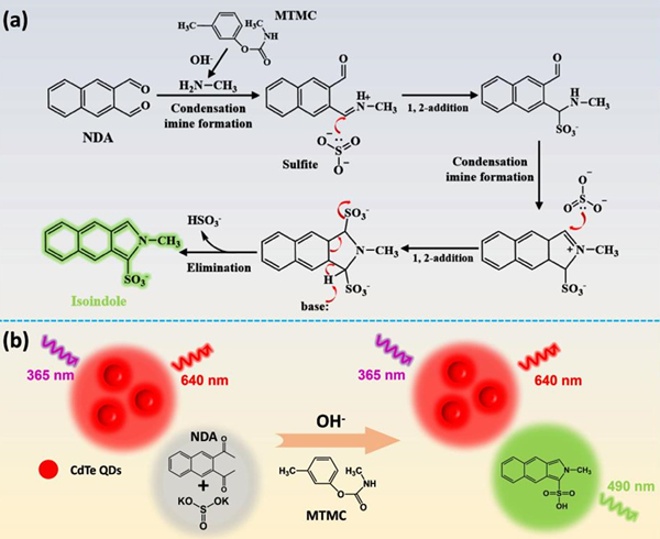 鉴于此,研究人员基于2, 3-萘二醛(NDA)和亚硫酸盐诱发的类 Strecker 反应原理,构建了一种无酶比率荧光探针,以 CdTe 量子点 (CdTe QD) 作为背景荧光,用于氨基甲酸酯农药(CPs)的全谱视觉识别。CPs加入后,通过亲核缩合反应产生绿色荧光的异吲哚,该荧光探针出现了从红色到绿色的明显颜色变化,实现对氨基甲酸酯的快速可视化响应,检测限(LOD)低至18.6 nM,远低于国家最大残留标准。