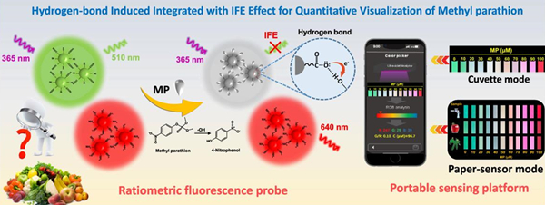 此外,通过集成绿色碳点和CdTe量子点(CdTe QD)构建了比率荧光探针,用于甲基对硫磷(MP)的高选择性定量检测。在碱性条件下,MP能迅速水解生成对硝基苯酚(p-NP), 氢键加强的瞬时反应导致碳点和p-NP之间的内滤效应猝灭绿色荧光,从而导致探针产生由绿到红的灵敏荧光色度变化,检测限低至为8.9 nM。