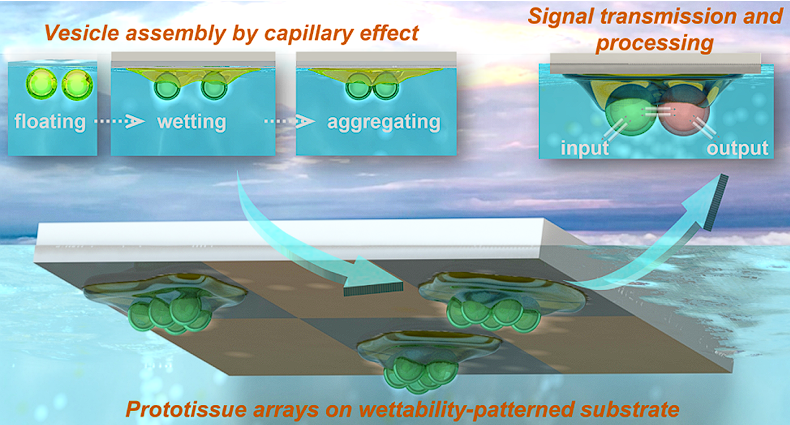 由人造细胞构建人造组织结构,是自下而上合成生物学的重要目标,其中关键在于能够控制个体人造细胞间的组装。与大多数依赖外部环境或复杂设备的方法不同,深圳大学刘洲团队汲取了培养细胞球体所采用的悬滴法的启发,采用了毛细流驱动的方法,利用具有图案化润湿性的盖玻片,成功将基于巨型单层囊泡(GUVs)构建的人造细胞以有序排列的方式组装成特定的组织阵列。此项研究为合成生物学、组织工程以及高通量分析领域提供了一种简洁、可扩展且可编程的方法,用以构建人造组织阵列。这一方法不仅在科学上具备重要的意义,同时也为未来生物技术的发展提供了崭新的可能性。