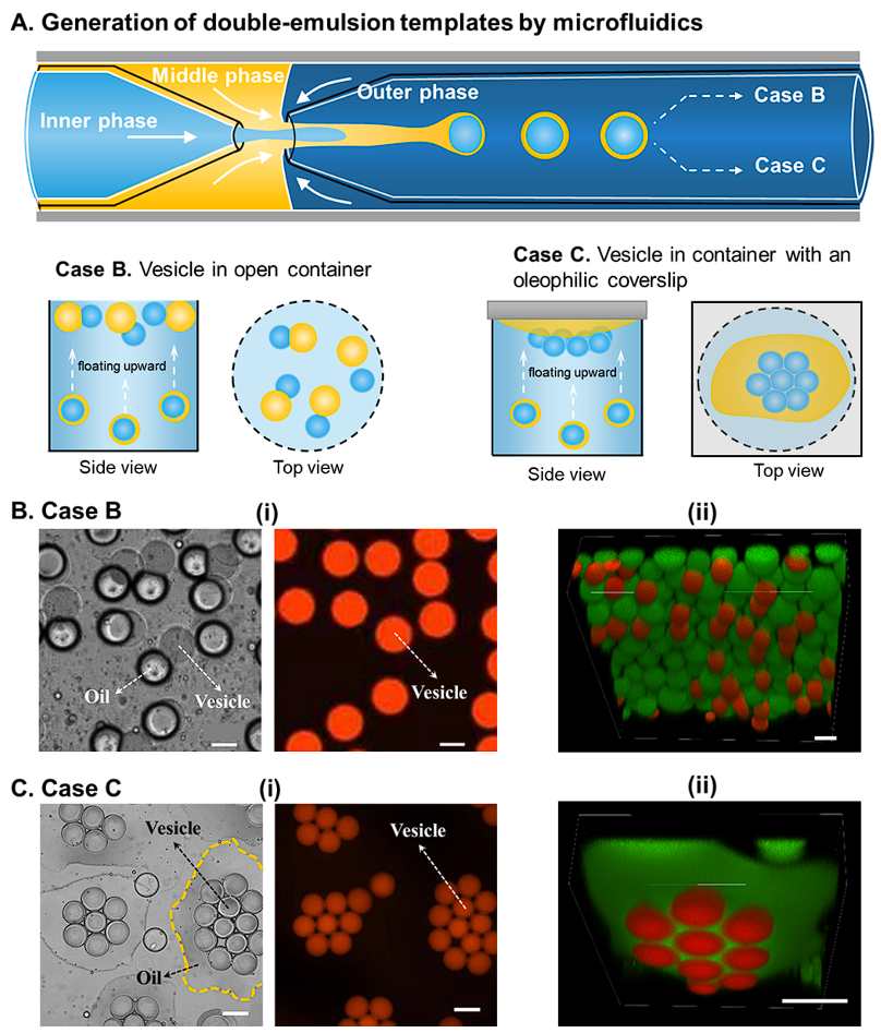 图一:脂质囊泡的产生和聚集。(A)微流控装置中产生 W/O/W液滴模板,然后分别将其收集在开放容器和带有亲油盖玻片的容器中。在Case B中的囊泡与油滴实现分离;Case C中在油润表面上囊泡聚集在一起。(B)(i)显微镜和荧光显微镜图像和(ii)共聚焦图像,显示收集在开放容器中的W / O / W囊泡分离过程,其中红色和绿色液滴分别是脂质囊泡和油相。C)(i)光学和荧光显微图像和(ii)共聚焦图像,显示通过在亲油盖玻片覆盖的容器中收集W / O / W液滴来紧密包装的脂质囊泡。