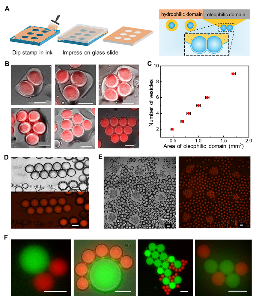 图三:通过具有润湿性图案的盖玻片实现囊泡聚集的阵列组织。(A)设计具有几何形状的微加工印章并在盖玻片上印刷具有润湿性图案的方法。(B)通过光学显微镜和荧光图像合并的图像显示,随着亲油结构域面积的增加,聚集的囊泡数量不断增加。(C)聚集囊泡的数量与亲油结构域面积的关系图。(D)光学显微镜和荧光图像显示囊泡聚集集落的纵横比在矩形亲油结构域下改变。(E)光学显微镜和荧光图像显示了在数独格上印制产生的多个囊泡聚集群。F)光学荧光图像显示由两种囊泡形成的囊泡聚集集落,它们通过红色和绿色荧光区分。