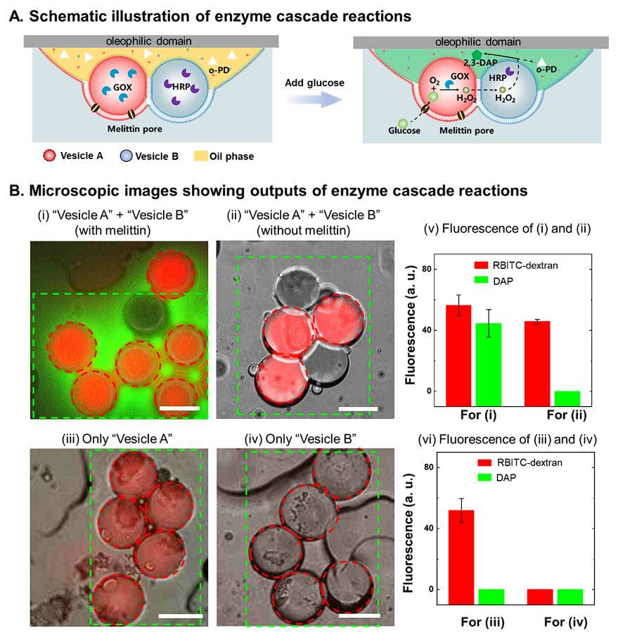 图五:基于聚集囊泡的组织模型中的酶级联反应。(A)展示了“囊泡A”、 “囊泡B” 和油筏之间的酶级联反应。当“囊泡A” 和“囊泡B” 都被封装在油筏中,加入葡萄糖后,油相中的报告分子会发出绿色荧光。(B) 荧光显微图像和荧光强度随时间变化的图表,显示了由以下组成的囊泡聚集群的情况:(i) 同时含有“囊泡A” 和“囊泡B”,(ii) 无蜜蜂毒肽的对照组,(iii) 仅含“囊泡A”,和 (iv) 仅含“囊泡B”。