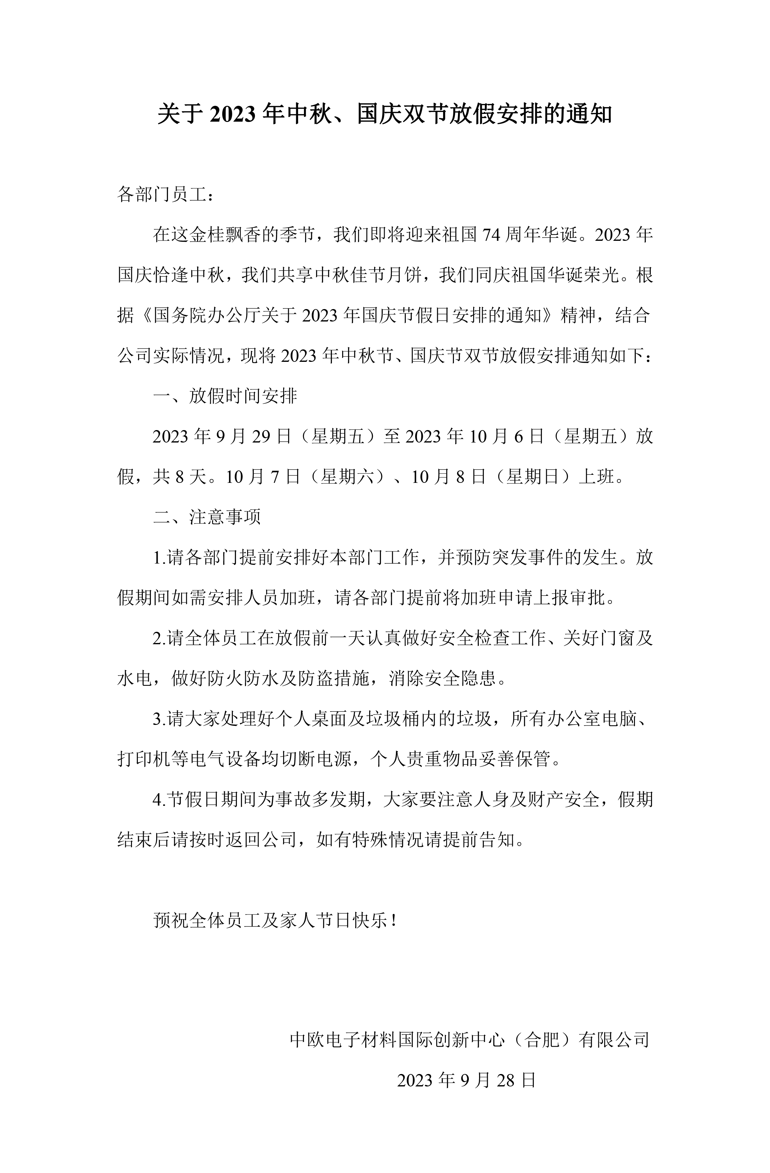 关于中秋、国庆双节放假安排的通知