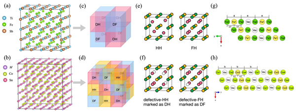 图1. (a) 和 (b) 理论上预测的 TiFe1.5Sb 和 MCo1.33Sn (M = Ti, Zr, Hf) 相变后的晶体结构;(c) 和 (d) 子晶格的排列方式;(e) 和 (f) 半Heusler (HH)、全Heusler (FH)、缺陷 HH (DH) 和缺陷 FH (DF) 子结构中的原子排列;(g) 沿z轴和 (h) 沿y轴观察的 Y 原子(Fe 或 Co)的排列。