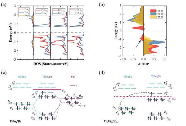 图2. (a) 和 (b) TiFe1.5Sb的原子投影态密度 (DOS) 和晶体轨道哈密顿群 (COHP);(c)和(d) TiFe1.5 Sb的分子轨道(MO)示意图,其中黑色虚线箭头表示从全Heusler (FH) 子结构向半Heusler (HH) 子结构的电子转移过程。