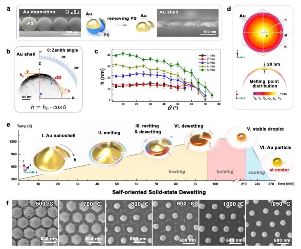 图1. 球形金纳米壳的自限域脱湿机制:(a)通过金沉积和随后用溶剂去除球形PS模板获得的金纳米壳的SEM图像;(b)从(a)中提取的典型金纳米壳的透射电镜图像;(c)金纳米壳厚度与测量角度和沉积时间的关系分析;(d)理论模拟了厚度对金纳米壳熔点梯度的影响;(e)金纳米壳在退火处理过程中自发脱湿成稳定在晶格中心的金纳米粒子的示意图,定义为自限域脱湿过程;(f)在不同温度下退火的一系列SEM结果观察到金纳米壳演变成ncp阵列。