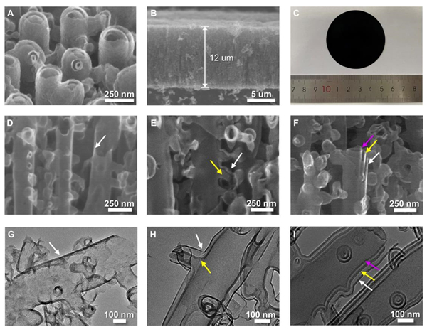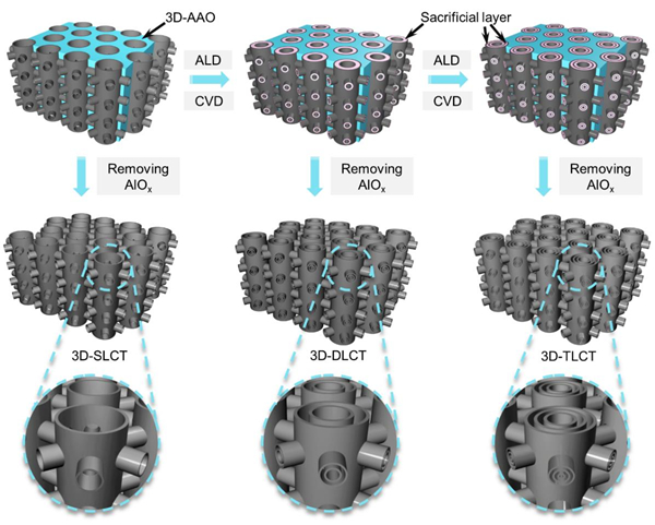 固体所博士生陈干等以团队前期创制的三维互连多孔阳极氧化铝(简称3D-AAO)为模板,在模板孔的限域诱导下交替进行化学气相沉积碳层和原子层沉积AlOx牺牲层,选择性腐蚀氧化铝模板和牺牲层AlOx后,构筑了同轴结构的两层和三层碳管互连组成的三维框架(简称3D-MLCT)。各种分析手段研究表明,在这种同轴多壳层三维互连碳管网格膜中,所有的碳管都类似于“俄罗斯套娃”结构,其内层碳管均匀地填充在同轴外层碳管的内部;这种三维互连套娃碳管网格膜不仅具有更大的表面积存储电荷,而且其中的垂直碳管之间具有高度取向的大孔结构,有利于电解液离子快速传输。