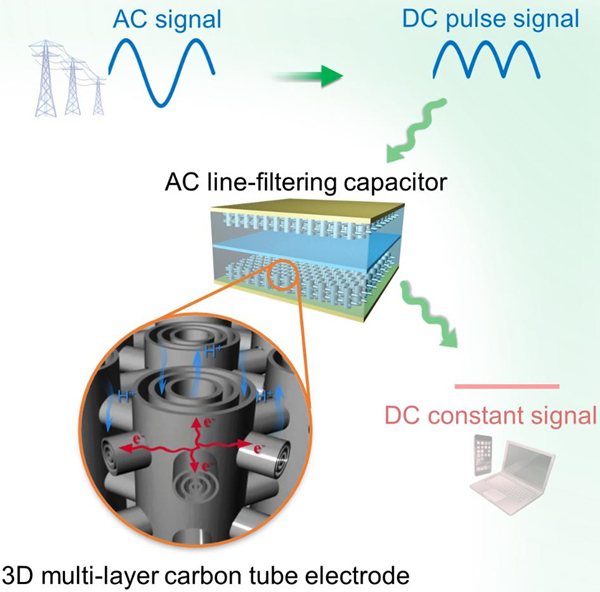 图3. 基于套娃碳管三维框架电极的超级电容器及其交流滤波示意图。