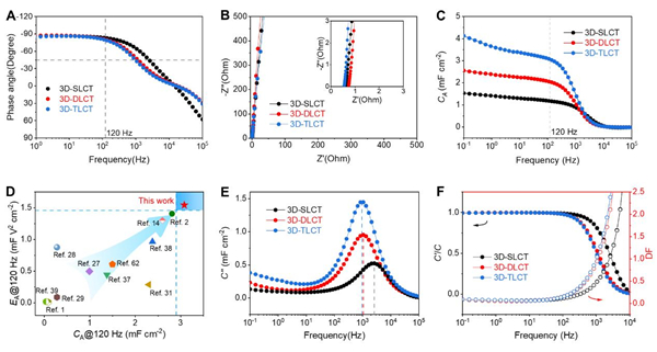 科研人员以这种三维互连套娃碳管网格膜为电极,构筑了对称型双电层电容器。研究发现三层套娃碳管电极构建的器件,在频率120 Hz下表现出-80.1°的阻抗相位角和0.25毫秒(ms)的较短电阻-电容(RC)时间常数,表明该电极类似于有序光滑的离子快速输运通道,促进了离子的快速分布。器件的面积比电容达到3.08 mF cm-2,比商用AECs的(约0.08 mF cm-2)高2个数量级,并且也高于迄今报道的三明治构型的水系滤波超级电容器。此外,还发现器件的损耗因子低、储能效率高。