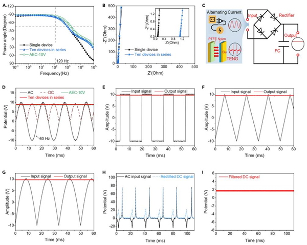 图5. (A-B) 单个器件及器件组(10个器件串联)性能对比;(C) 滤波电路示意图;(D) 器件组与商用铝电解电容器对交流信号滤波效果对比;(E-G) 器件组对方波、三角波和任意波的滤波效果;(H-I) 器件组对摩擦纳米发电机发出电信号的滤波效果。
