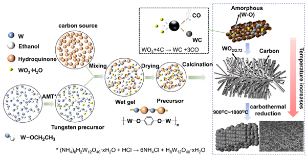 图1. WC前驱体的反应机理和煅烧过程示意图。