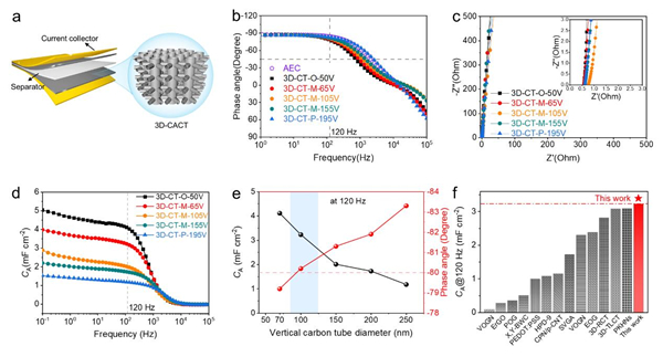 科研人员进一步以3D-CACT为电极,组装双电层电容器。测试发现器件在120 Hz下具有-80.2°的相位角、小于0.07 Ω cm2的等效串联电阻以及0.25毫秒的较短电阻-电容(RC)时间常数,表现出快速频率响应性能。该器件在120 Hz下的面积比电容达到3.23 mF cm-2,远高于商用铝电解电容器(约0.08 mF cm-2),并且高于迄今报道的三明治构型的水系滤波超级电容器的面比电容。上述结果表明,3D-CACT纳米阵列电极能够同时提供高速离子传输通道和丰富电荷吸附位点,具有优异的滤波性能。