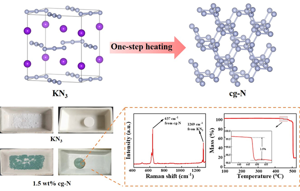 图. 一步加热法合成立方偏转聚合氮的技术路线与拉曼光谱和热重分析表征结果。