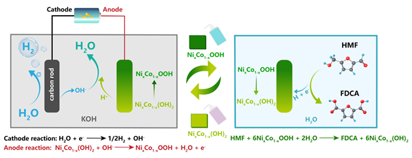 利用可再生能源将生物质衍生分子(如5-羟甲基糠醛(HMF))转化为高附加值产品,同时实现制氢,为可持续化学品和能源的制备提供了广阔的机遇。然而,HMF的氧化及电化学氧化过程通常需要强碱条件和膜的使用。在强碱环境下,HMF不稳定,易形成低聚物,从而降低产物的纯度,并且产物往往以羧酸盐的形式存在,增加了分离的难度;而膜的使用则进一步增加了转化成本。