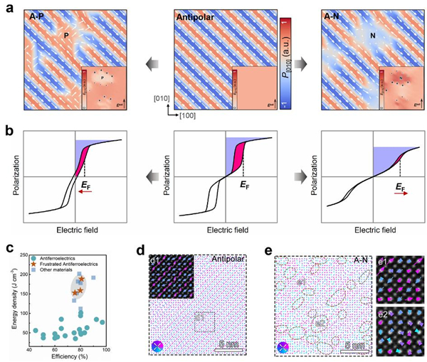 研究人员在深入分析反铁电材料物理机制基础上,提出了一种新的极化构型阻挫设计策略。通过在反铁电中引入非极性或极性组分,成功调控了反铁电-铁电相变场与回滞损耗。理论研究表明,构建局部阻挫微区导致极化不连续,诱导产生界面净电荷,形成了局部的内建电场。对于非极性微区阻挫的反铁电(A-N)结构,内建电场降低了反铁电区真实电场强度,从而延迟了反铁电-铁电相转变。撤去电场后,无自发极化的非极性区通过静电能效应带动反极性区快速恢复,减小了回滞损耗;而极性微区阻挫的反铁电(A-P)结构显示了相反的结果(图1a,b)。实验上,基于经典的反铁电锆酸铅,构建了不同阻挫极化类型的反铁电体系,实验结果与理论预测高度一致,表明阻挫设计的有效性。得益于A-N结构中更稳定的反铁电性和低回滞损耗,实现了高达189 J/cm3的超高储能密度和81%的储能效率(图1c)。进一步的电镜结构表征表明,相对于长程反平行序结构的锆酸铅(图1d),通过非极性顺电相的引入,长程反平行序被破坏形成了反极性与非极性共存的阻挫结构(图1e),证明了阻挫结构存在的真实性。