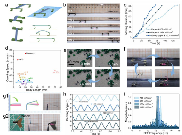 图2. 基于优异性能和编程结构,设计出的集爬行、跳跃、游泳、站立于一体的光驱机器狗和高速振荡器。