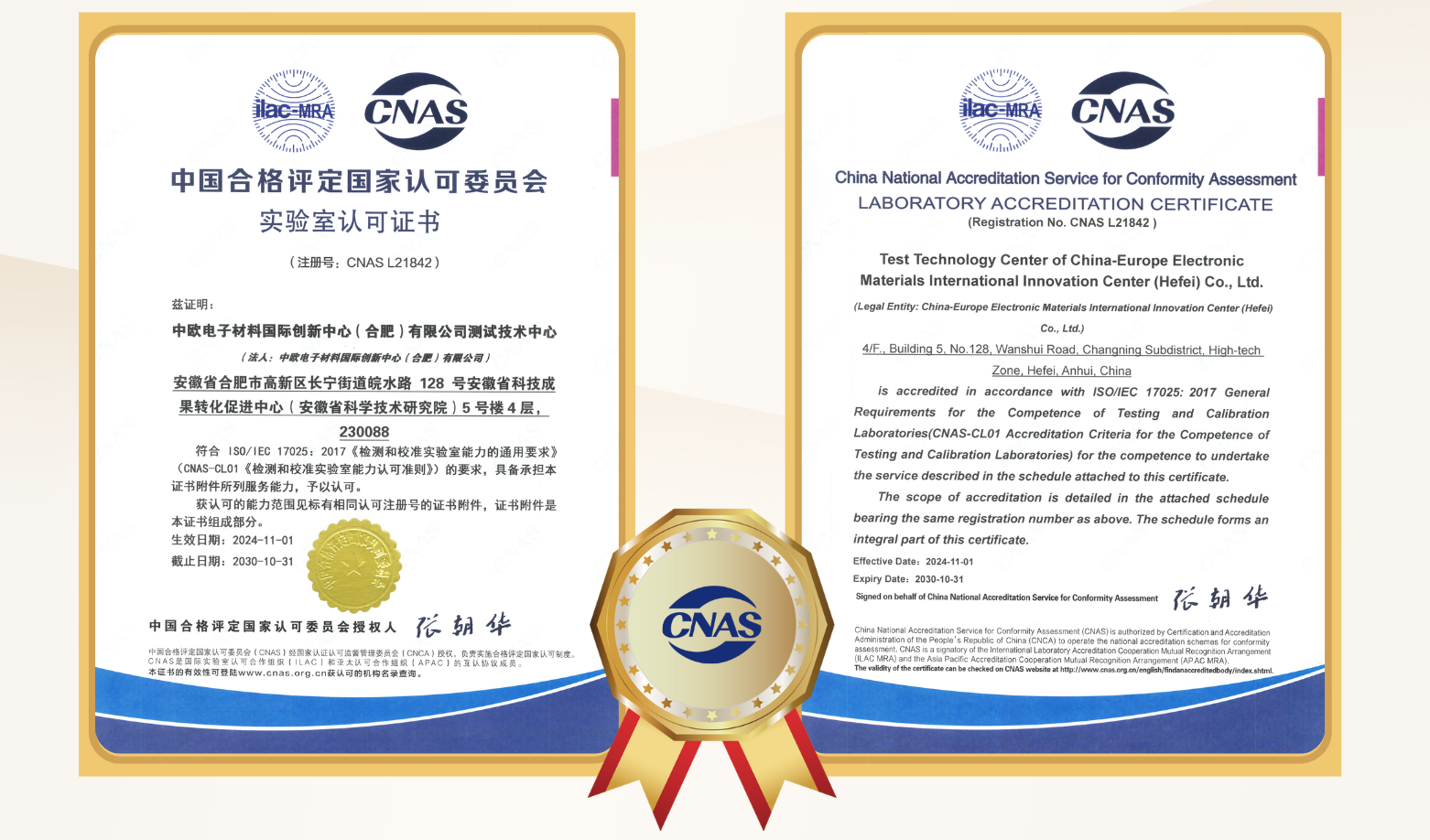 本中心于2024年11月首次通过中国合格评定国家认可委员会资质评审及合格评定,获得了CNAS实验室认可证书。CNAS认证范围涵盖了多种电子材料的关键检测领域,包括塑料、橡胶、微球、导电胶等30多项参数,可出具CNAS检测报告。